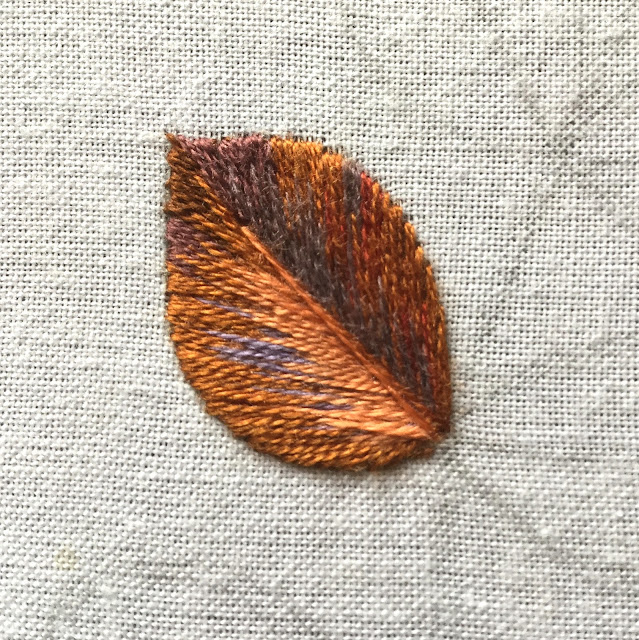 | First row, over split stitch with the angle of stitch moving around the leaf shape. Whilst working the first row, be mindful of maintaining the angle of stitch. |